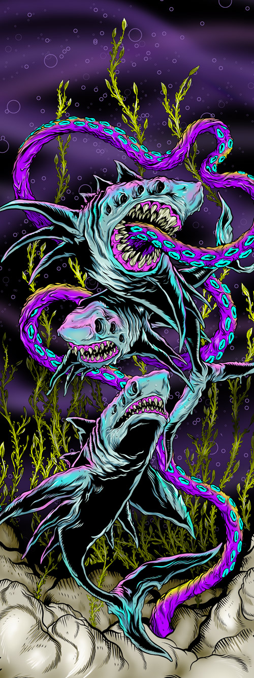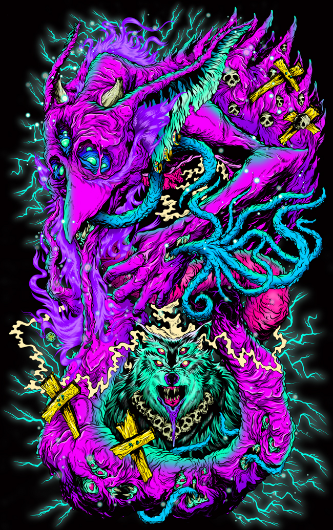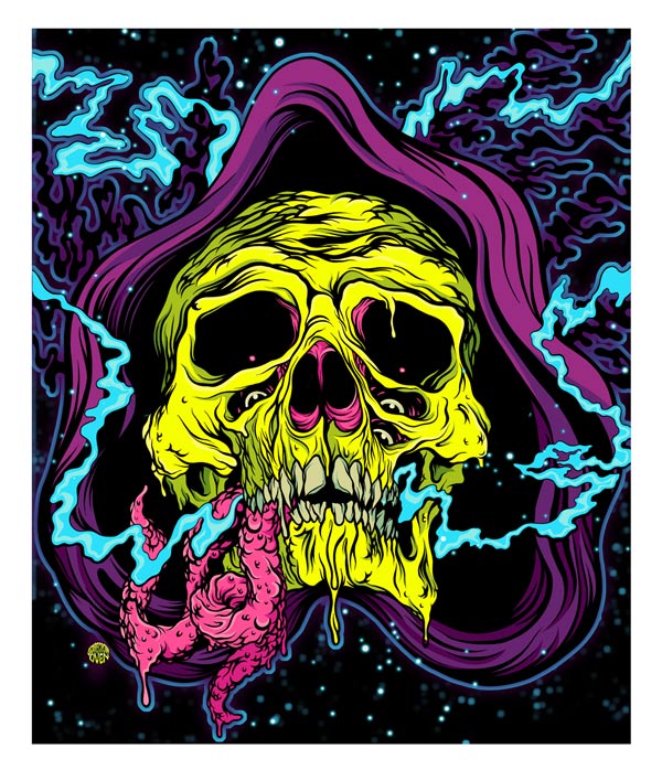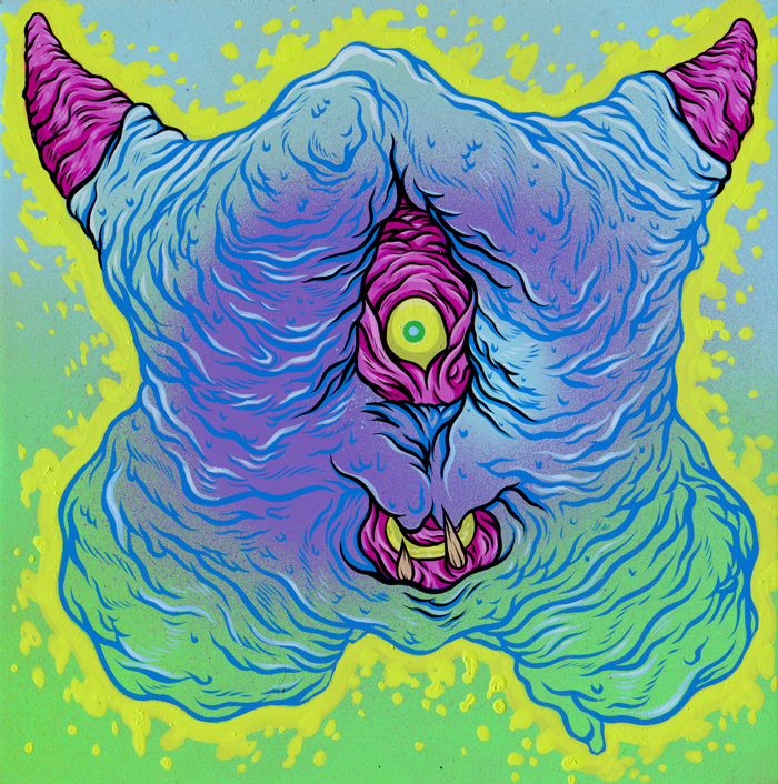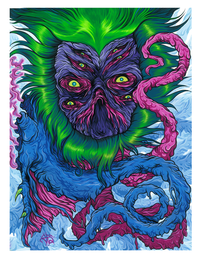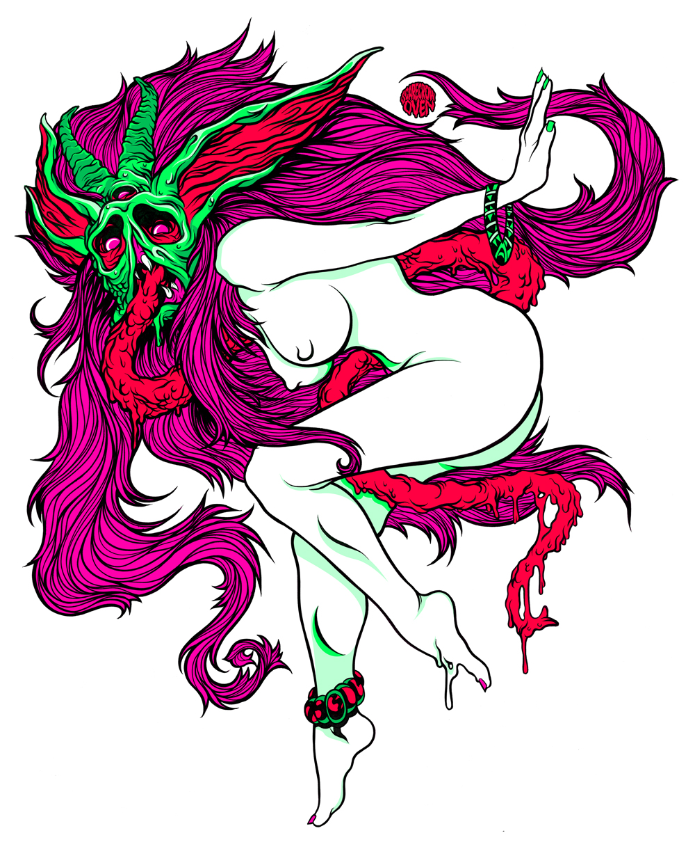 Mysterious New York-based illustrator SCARECROWOVEN is a fan of gore, guts, and oozing appendages. His gnarled creatures take a cue from ‘comic books, sci-fi and horror movies and all the illustration that came out of the skateboard world in the 80’s.’ He describes himself as an alien emissary sent to our planet 12 million seven hundred thousand years ago, but in more earthly terms he is a graduate of the graphic design program at New York’s School of the Visual Arts.