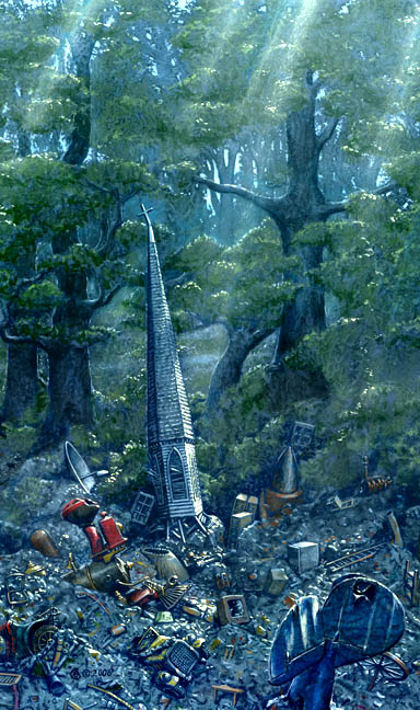 Artwork: “Middle-American Debris” copyright © 2006 Alan M. Clark. Cover illustration for Just North of Nowhere by Lawrence Santoro – Annihilation Press.