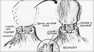 The first dog heads to enjoy, if that word can be used, full cerebral function were those [of] transplantation whiz Vladimir Demikhov, in the Soviet Union in the 1950s. Demikhov minimized the time that the severed donor head was without oxygen by using “blood-vessel sewing machines.” He transplanted twenty puppy heads—actually, head-shoulders-lungs—and forelimbs units with an esophagus that emptied, untidily, onto the outside of the dog—onto fully grown dogs, to see what they would do and how long they would last (usually from two to six days, but in one case as long as twenty-nine days).